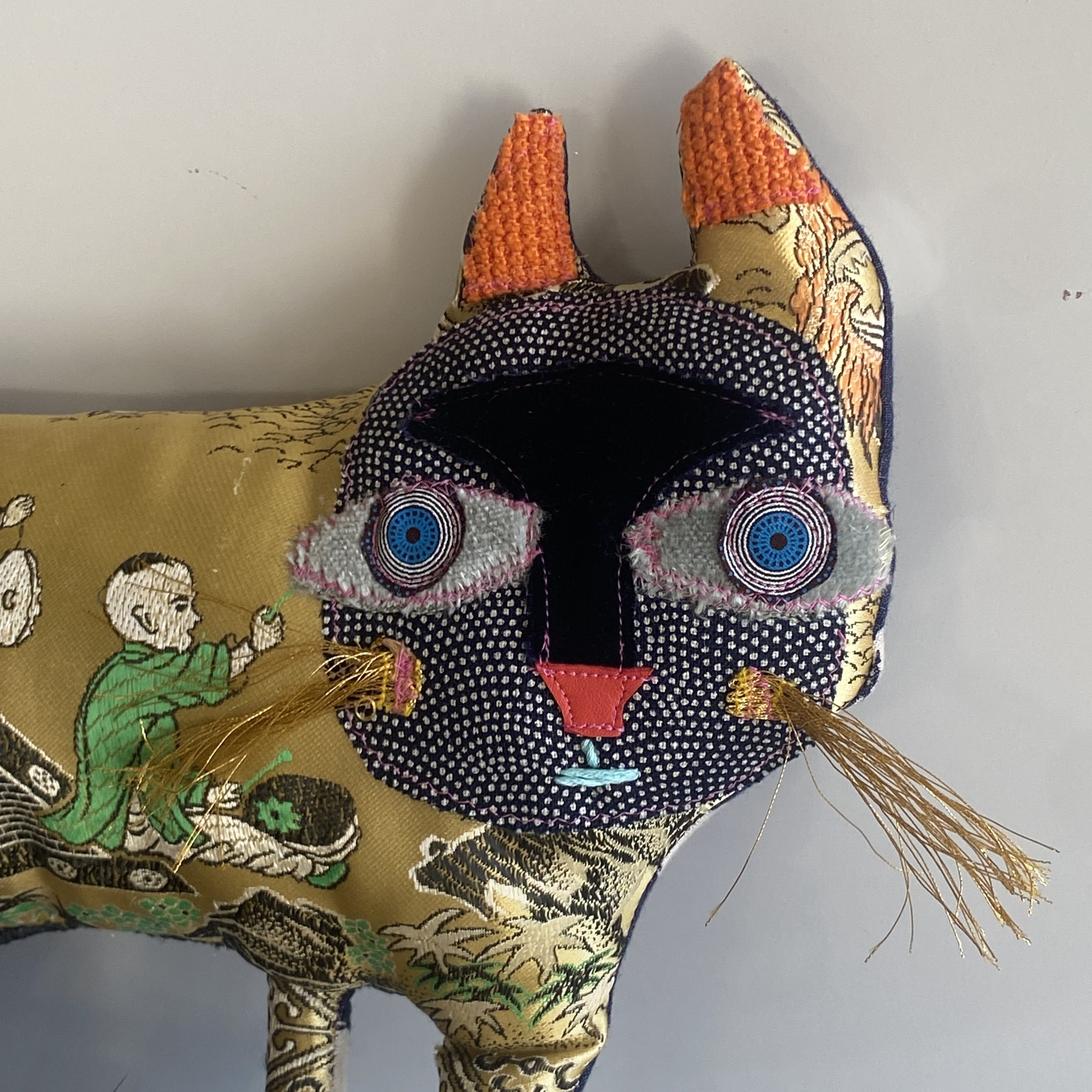 Made from fabric brought back from China by a traveling friend. Their whiskers are fabulously gold and charming. Their name is Grimble and they like to hang out in wine bars and purr around the ankles of people with really nice shoes. Size: about 27 inches in length including tail. Top of ears to front toe is about one foot. Basically the size of a real cat!
